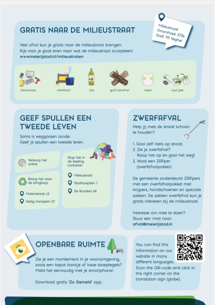 -Milieustraten: Voor het storten van grofvuil en ander afval kun je terecht bij de milieustraten in Meierijstad.
